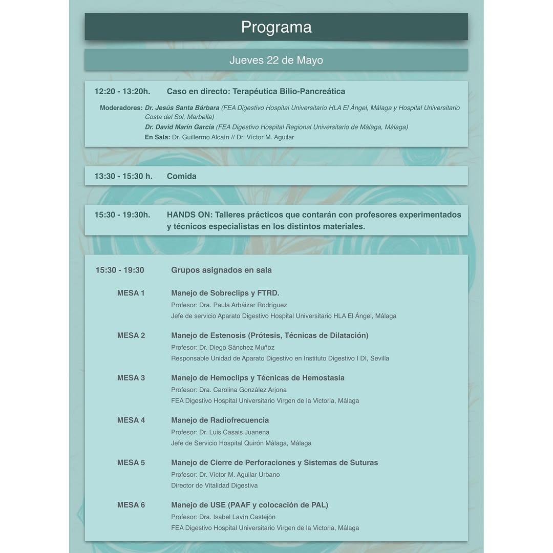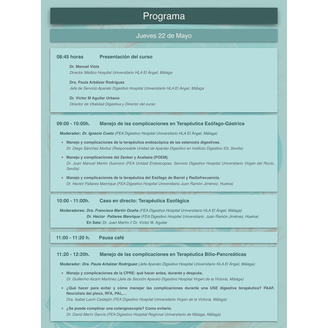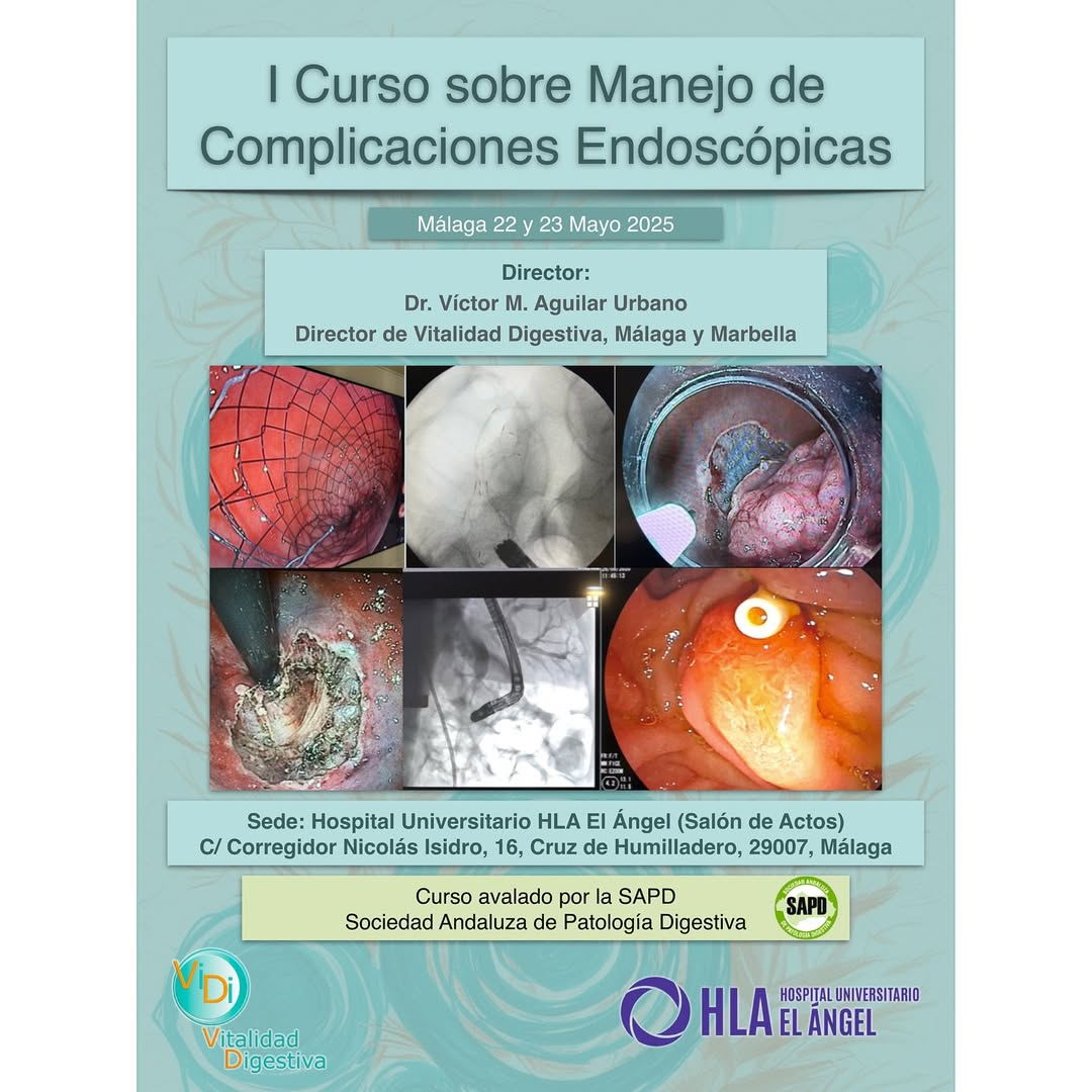 El Hospital Universitario HLA El Ángel acogió los días 22 y 23 de mayo de 2025 el I Curso sobre Manejo de Complicaciones Endoscópicas, una formación pionera dirigida por los doctores Víctor Aguilar y Paula Arbáizar. Este evento reunió a 65 especialistas en aparato digestivo de España y Latinoamérica, ofreciendo una actualización práctica y rigurosa sobre el manejo de complicaciones en procedimientos endoscópicos digestivos, con un enfoque centrado en la seguridad del paciente.