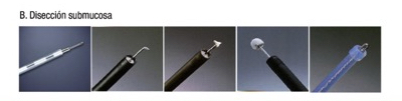 Además de los bisturís, es necesario un completo utillaje que incluye capuchas blandas transparentes para facilitar la disección, y pinzas especiales de coagulación para tratar la hemorragia. Además, para la inyección submucosa se emplean soluciones diferentes al suero salino (ácido hialurónico, glicerina al 10%, metilcelulosa, etc.) con las que la elevación de la mucosa es más duradera.
